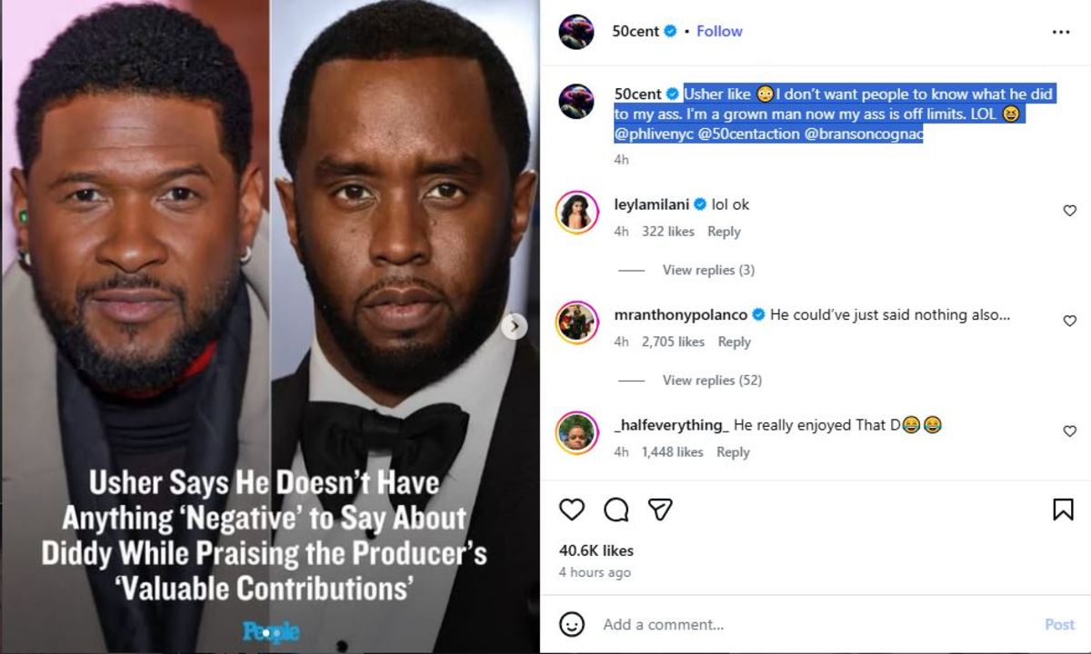 “Usher like 😳I don’t want people to know what he did to my ass. I’m a grown man now my ass is off limits. LOL 😆 @phlivenyc@50centaction@bransoncognac.”