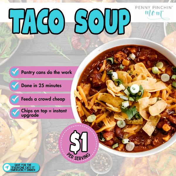 Start with Honey Garlic Chicken Thighs with Rice if you need something that tastes way more expensive than $7, try Taco Soup when you need to stretch one pound of meat into six servings, or make Sausage and Potato Hash on nights when you just need everyone fed and happy. Pick one for tonight. Cook it in one pot. Wash that one pot. You’re not choosing between your budget and your sanity anymore – you’re protecting both. That peace with four nights of spaghetti? You don’t need to make it anymore.
