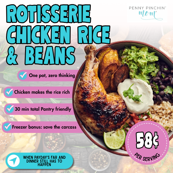 Payday is three days away, and this uses many ingredients that are probably already in the pantry. Shred half a rotisserie chicken ($5-7, use the rest for lunch), simmer with a can of black beans, rice, and chicken broth. The chicken makes the rice taste rich without adding another ingredient. Total cost: $3.50 for 6 servings, about 58¢ per serving. Everything cooks together in 25 minutes – rice absorbs the flavors while you’re folding laundry. Prep time: 5 minutes. Cook time: 25 minutes. Tip: Freeze the chicken carcass for homemade stock next week.