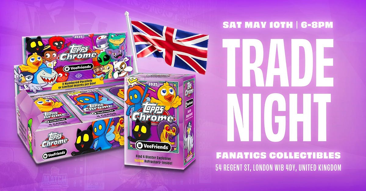 Celebrate the official UK launch of Topps VeeFriends Chrome in the heart of London.Limited quantities of Topps VeeFriends Chrome Hobby Boxes will be available for purchase on-site.Join live pack ripping and trading with fellow collectors and members of the VeeFriends and Fanatics communities.Meet VeeFriends President Andy Krainak, Director of Marketing May Niu, and connect with the VeeFriends UK community.Experience the brand-new Fanatics Collectibles flagship store, designed to bring collectors together for moments like this.